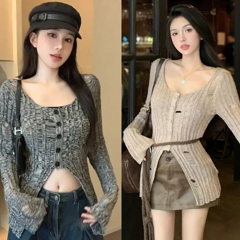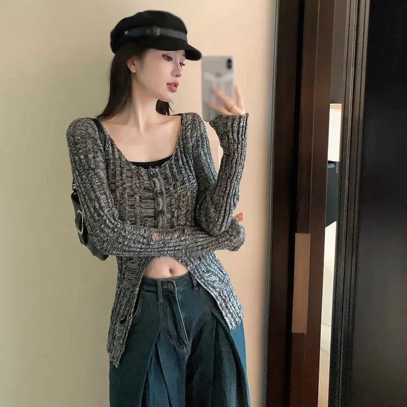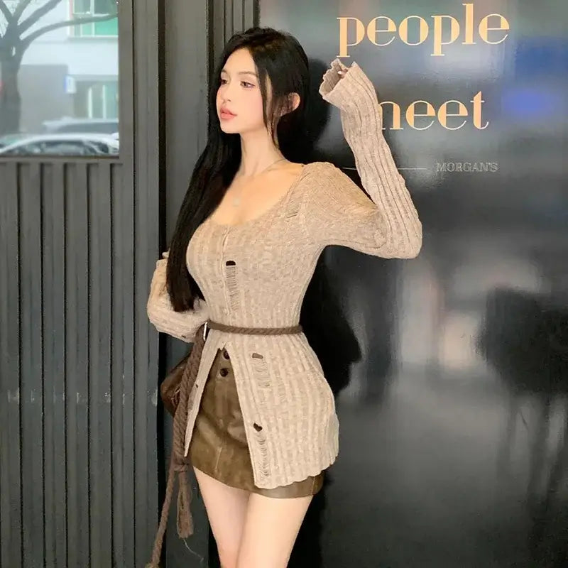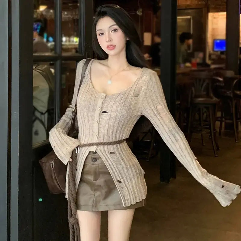 Spring Autumn Women's Sweater Solid Color Hollow out Hole Split Slim Leisure Temperament Knitted Long Sleeves Cardigan