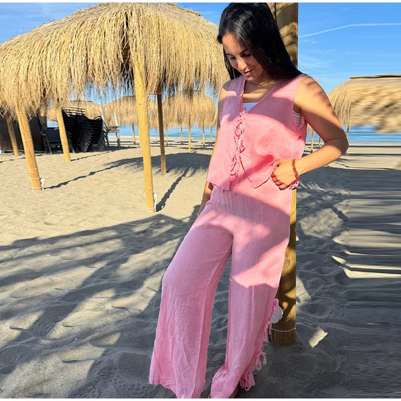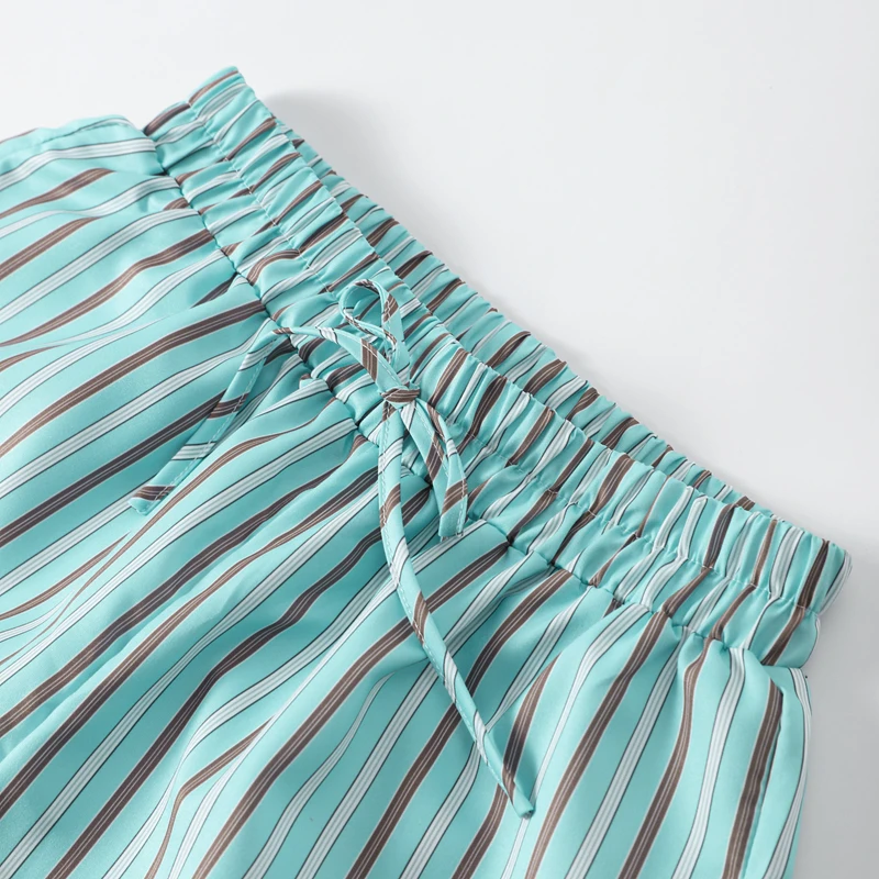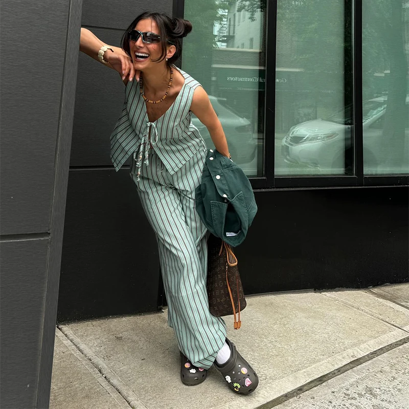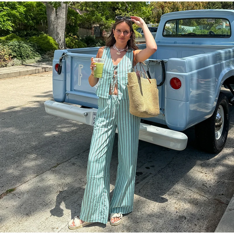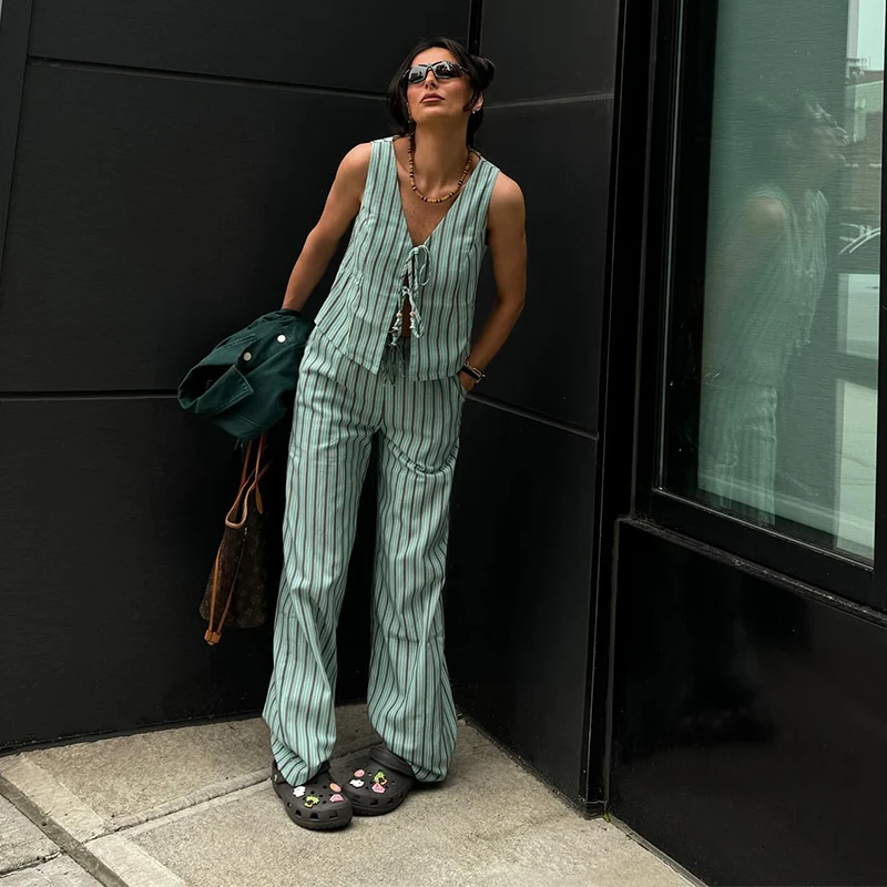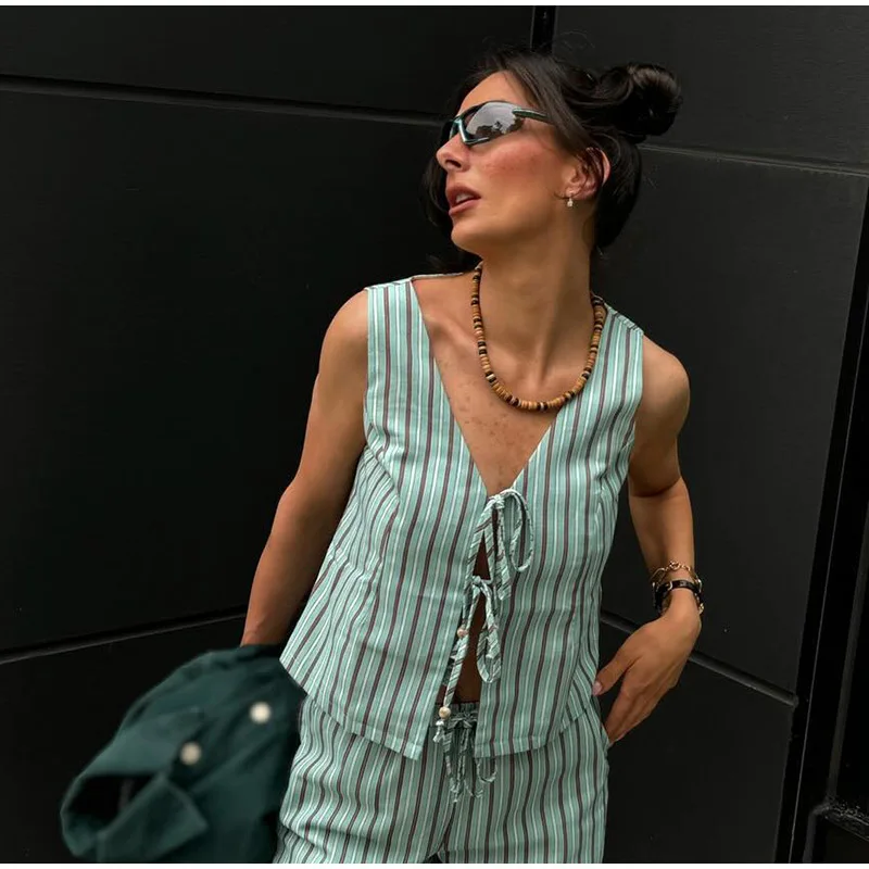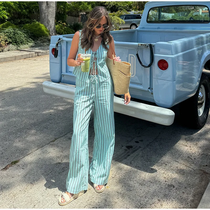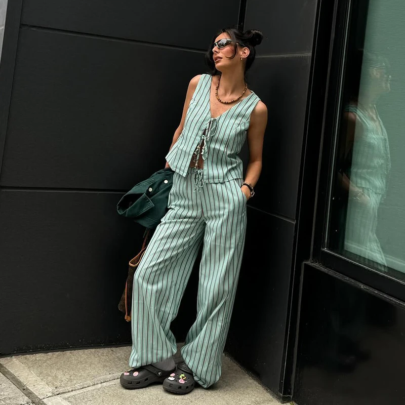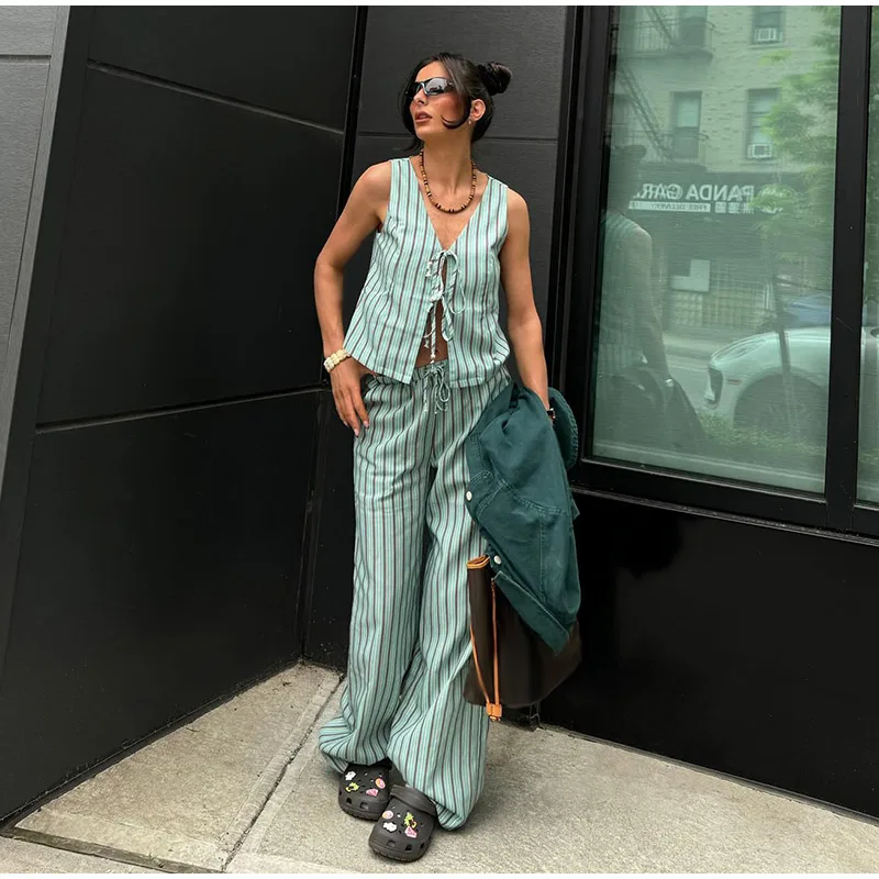 Numéro de modèle : Ensemble gilet et pantalon à rayures et lacets pour femme