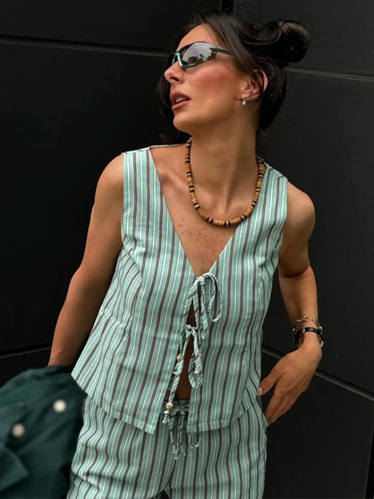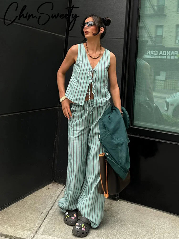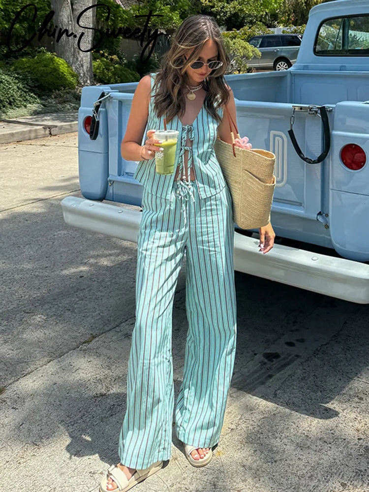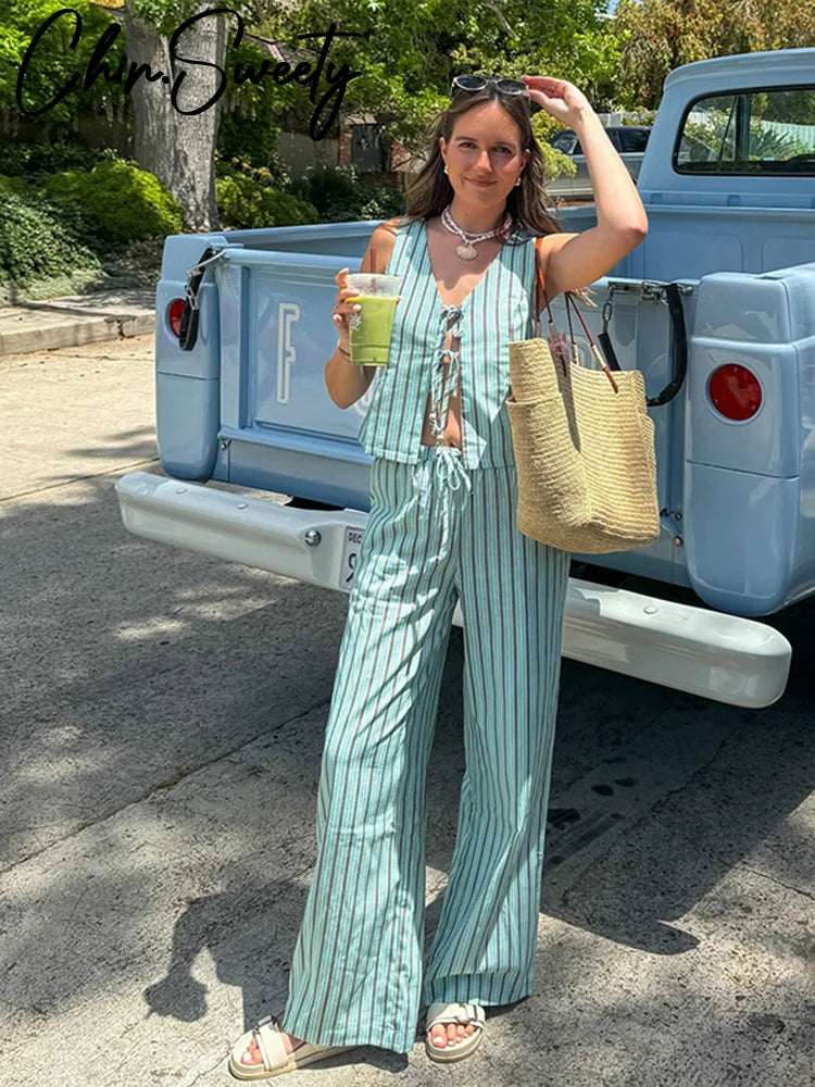 Stripe Lace Up Hollow Out Vest Trouser Suit Women Sleeveless Vest Top Bow Bandage Wide Leg Pant Set Female Holiday Lady Outfit