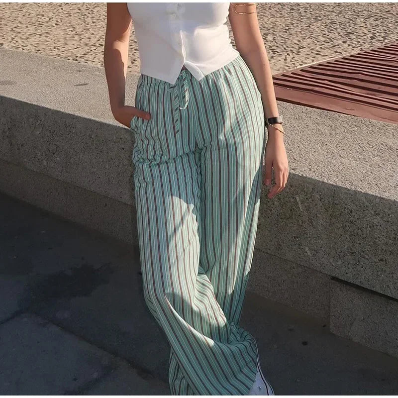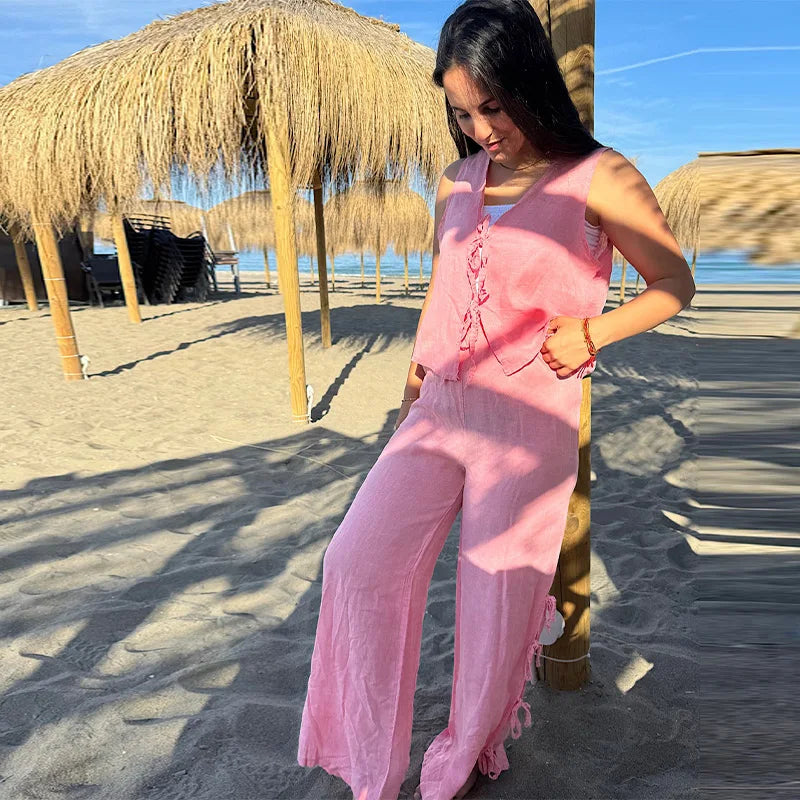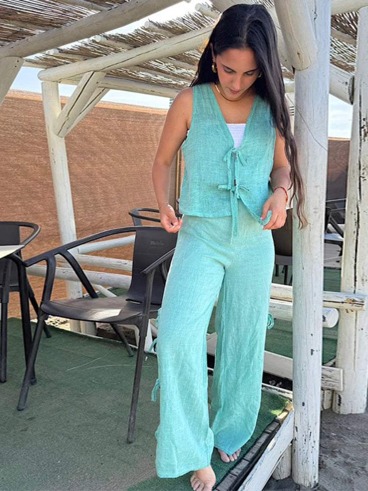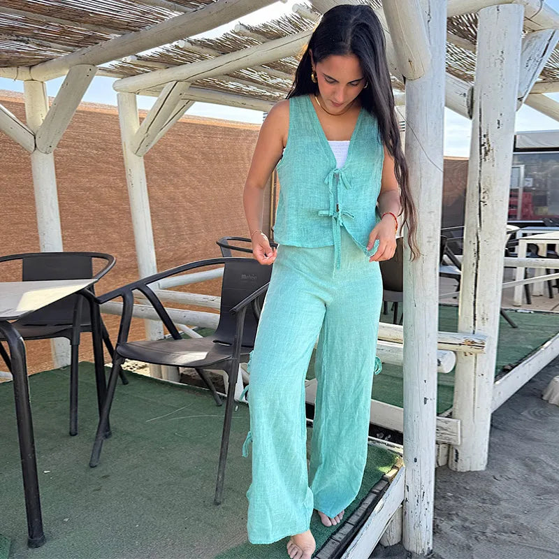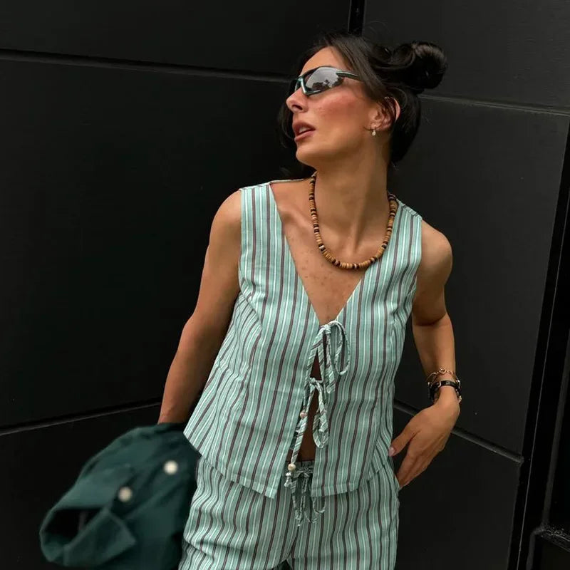 Stripe Lace Up Hollow Out Vest Trouser Suit Women Sleeveless Vest Top Bow Bandage Wide Leg Pant Set Female Holiday Lady Outfit